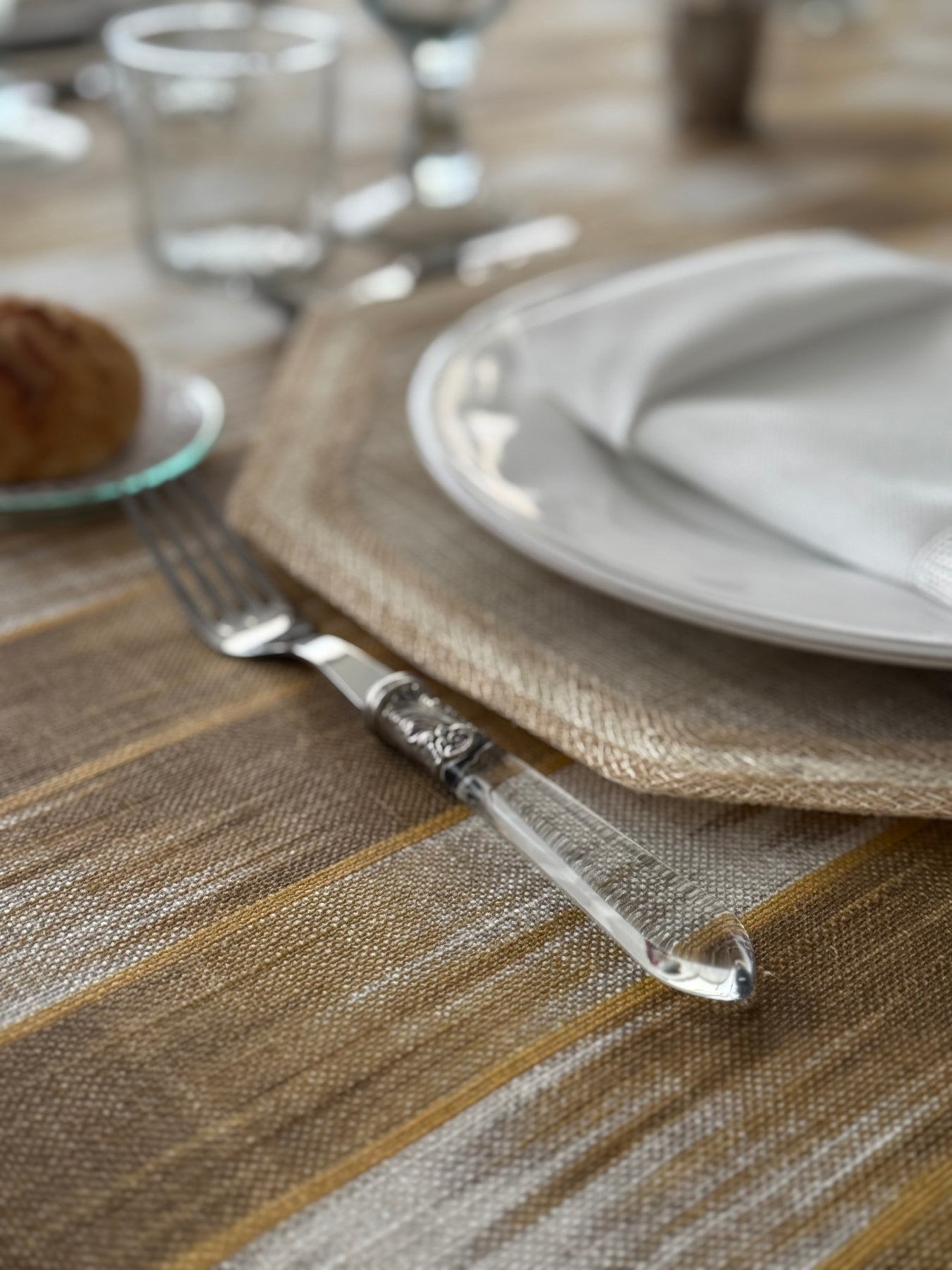 En La Compañía Francesa nos gusta hacer manteles cuadrados para mesas redondas, ya que lucen más sofisticados y modernos.