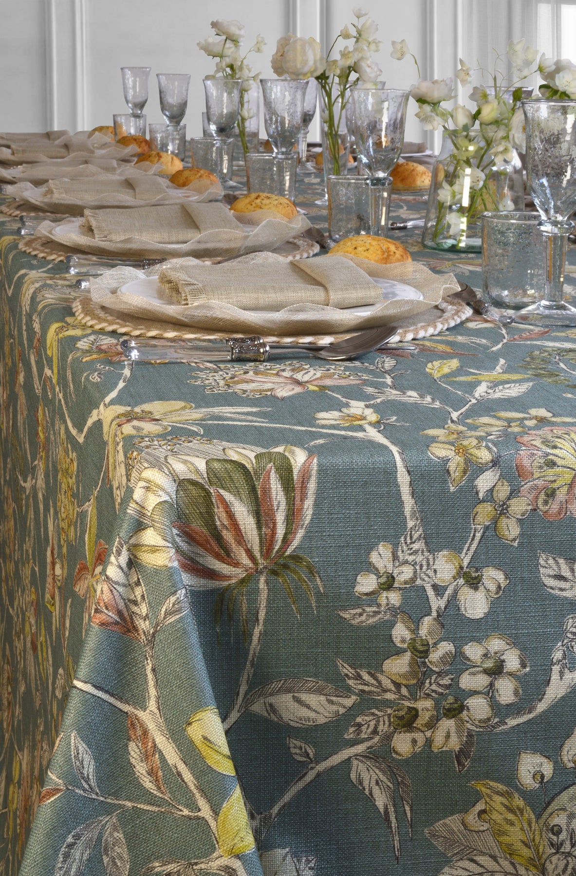 En La Compañía Francesa confeccionamos manteles cuadrados para mesas redondas porque resultan más actuales, frescos y elegantes.