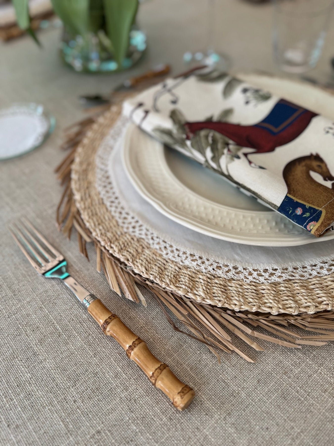 En La Compañía Francesa confeccionamos manteles cuadrados para mesas redondas porque resultan más actuales, frescos y elegantes.