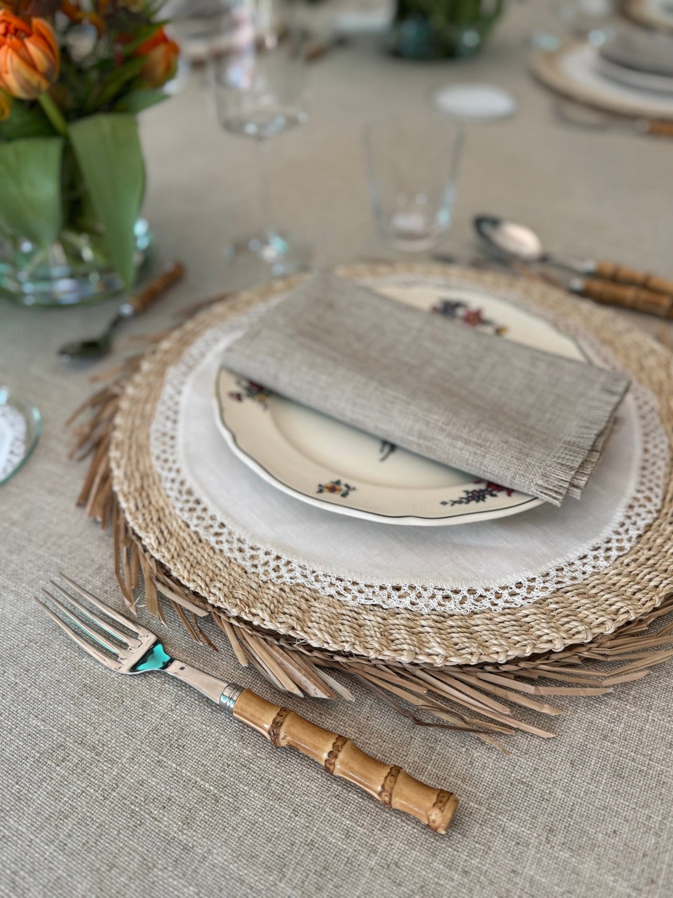 En La Compañía Francesa nos gusta hacer manteles cuadrados para mesas redondas, ya que lucen más sofisticados y modernos.